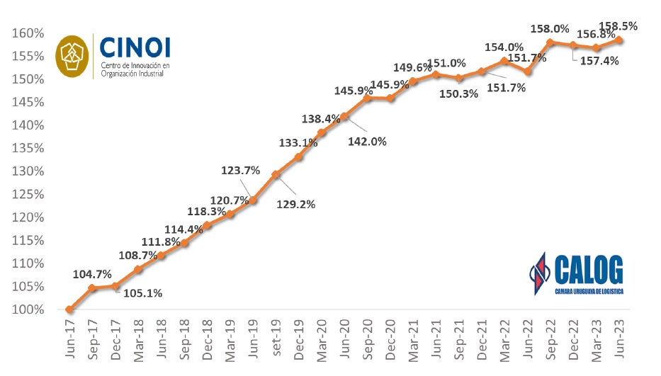 Actualmente presenta una variación del 58,5%, fijando la base al momento de su creación en junio 2017. Este trimestre (abril, mayo, junio) incrementó un 1,1% respecto al trimestre anterior, principalmente debido a aumentos de salarios. Teniendo en cuenta la variación interanual, se tuvo un incremento de 4,5% comparado al mismo periodo de 2022.