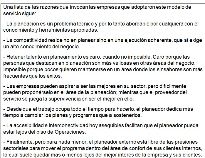 Si uno ingresa “Planning as a Service” (encomillado para más precisión) en el buscador de Google recibirá más de 600 mil hallazgos, con decenas de oferentes que atienden centenares de clientes grandes y no grandes, en todos los sectores de actividad, en una modalidad donde la generación de los planes y programas y su presentación a los decisores para aprobación o enmienda se terceriza en una empresa especialista en planear.
