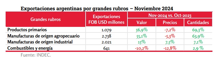 En paralelo, en nov-2024 las importaciones fueron de USD 5.245 millones con una disminución en valor del 4,3% interanual. El volumen total importado y los precios tuvieron una disminución del 0,2% y del 3,9%, respectivamente.