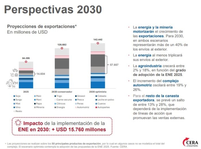 Tomando en cuenta la evolución proyectada de las exportaciones, Landa estimó que la implementación de la ENE podría sumar alrededor USD 15.760 millones para 2030, totalizando USD 142.442 millones, lo cual representaría un incremento del 70% respecto a los valores exportados en 2025, y concluyó que la competitividad será alcanzable si cambiamos el horizonte de nuestra mirada e internalizamos que, como dice el lema de la CERA, “Exportar es trabajo y desarrollo”.