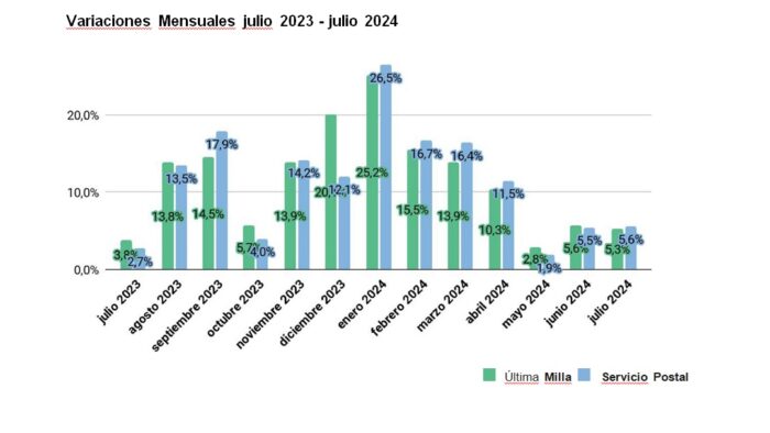 Con base en estos factores, AECA estima un piso de aumento del 4,33% para los servicios postales y del 4,64% para los servicios de última milla, lo que refleja las presiones inflacionarias que afectan al sector. El índice mensual de costos (IMC) de julio mostró que las actualizaciones salariales en las paritarias de camioneros y personal de seguridad privada tuvieron un impacto significativo, con un incremento del 6,49% en la mano de obra y un 20,71% en el rubro de seguridad.