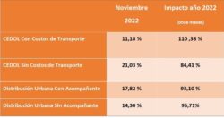Mientras que a nivel anual, en lo referido los primeros once meses del año 2022, se indicó que las subas se » debe principalmente a los aumentos de Combustibles, que en lo que va de 2022 subieron algo más del 111%, y a la fuerte suba de los componentes del transporte, especialmente los neumáticos que han aumentado 121%. En el caso de los costos de mano de obra, han comenzado a tener mayor incidencia a partir de la firma de la última paritaria (107% más algunos costos adicionales), lo cual se ve reflejado en los indicadores del presente mes.