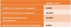 En su análisis la entidad empresarial destacó que el  incremento del combustible en los primeros días del mes de marzo, del orden del 7,25%, así como el aumento salarial firmado para este mes (25% sobre los valores de febrero), motivan la elaboración de una proyección de impacto para el mes en curso por parte del Departamento Técnico de CEDOL. De esta forma, los valores proyectados para el mes de marzo 2024 son los siguientes: