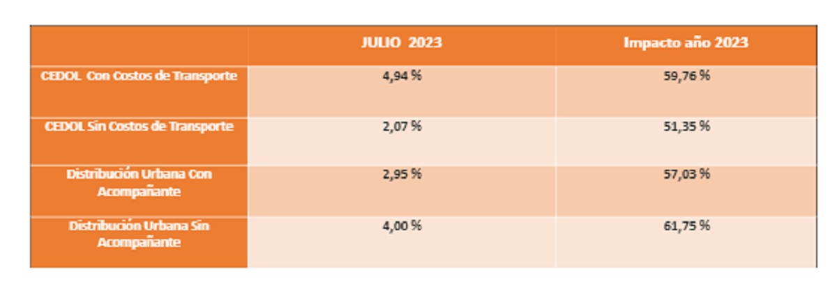 Las variaciones de costos logísticos del mes de julio se mantuvieron dentro de los comportamientos de los números generales de la economía, con una tendencia alcista como se ve reflejada en los incrementos de otros indicadores oficiales como el IPC o IPIM. En el indicador CEDOL Sin Costos de Transporte se puede observar que el impacto fue menor, dado que los componentes que más inciden en el mismo, como Mano de Obra, alquileres y energía eléctrica, registraron cambios menores o nulos para el mes de julio. Sí mostraron cambios otros ítems como el pallet 17,2 %, film stretch 18,9% y telecomunicaciones con un impacto casi del 10,47%.