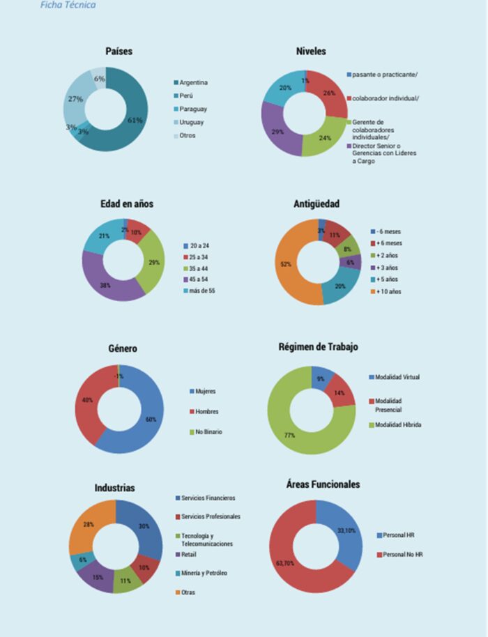 La muestra del estudio incluye 260 casos de varios países de América Latina, con un enfoque principal en Argentina. La encuesta, compuesta por 38 preguntas, abarca temas como la caracterización del trabajo híbrido, la experiencia del empleado (EX), el desempeño individual, el liderazgo, el papel de la tecnología, y la productividad.
